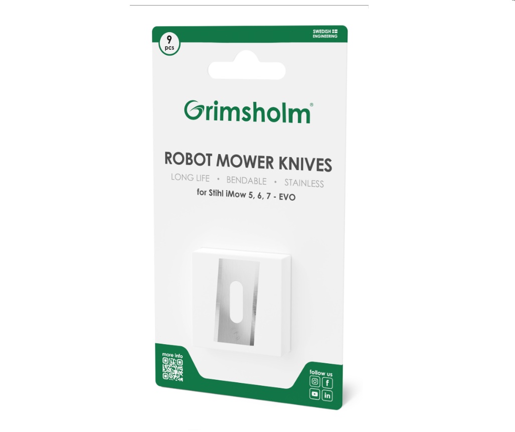 Grimsholm-knivene til Stihl er fremstillet af rustfrit stål og er optimeret til den bedst mulige balance mellem styrke, skarphed og slidstyrke for et optimalt klipperesultat. Den nøje kontrollerede hærdningsproces gør, at kniven bevarer en vis fleksibilitet, hvilket mindsker risikoen for knækkede knive, hvis robotten skulle ramme en sten eller andet hårdt materiale.